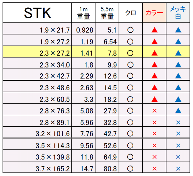 長尺物、表に無いその他のサイズはお問い合わせください。