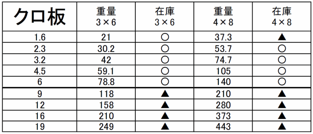 ※常時在庫品 〇 取り寄せ品 ▲ 製品として無いもの× 取り寄せ品は当日~翌日入荷。表に無いその他のサイズはお問い合わせください。取り寄せ品は当日~翌日入荷。シャーリング・レーザー・折曲げ加工・R曲げ加工等も対応できますので、定尺以外でお求めの場合はご相談ください。