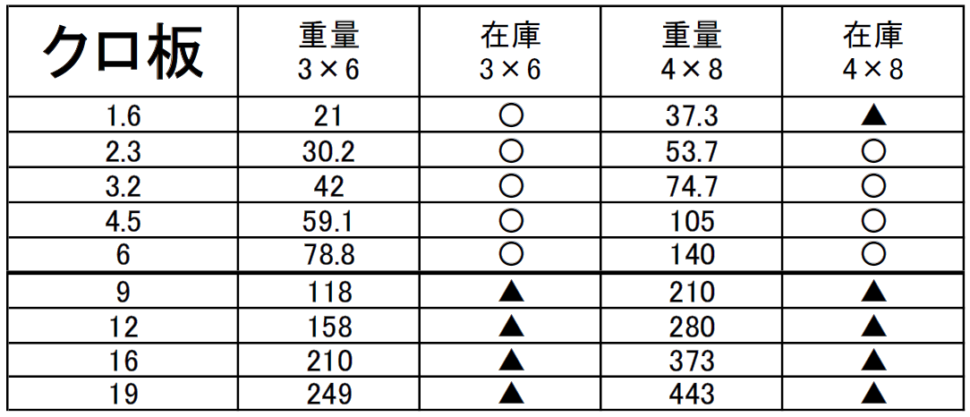 ※常時在庫品 〇 取り寄せ品 ▲ 製品として無いもの× 取り寄せ品は当日~翌日入荷。表に無いその他のサイズはお問い合わせください。取り寄せ品は当日~翌日入荷。シャーリング・レーザー・折曲げ加工・R曲げ加工等も対応できますので、定尺以外でお求めの場合はご相談ください。