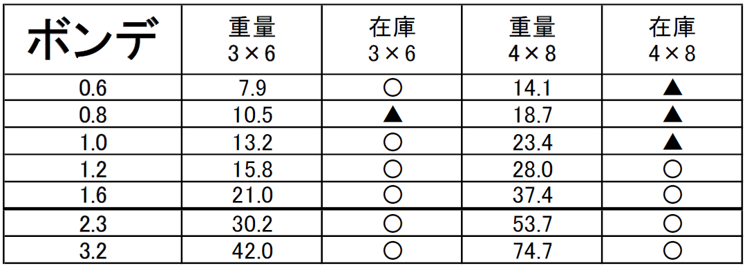 ※常時在庫品 〇 取り寄せ品 ▲ 製品として無いもの× 取り寄せ品は当日~翌日入荷。表に無いその他のサイズはお問い合わせください。取り寄せ品は当日~翌日入荷。シャーリング・レーザー・折曲げ加工・R曲げ加工等も対応できますので、定尺以外でお求めの場合はご相談ください。